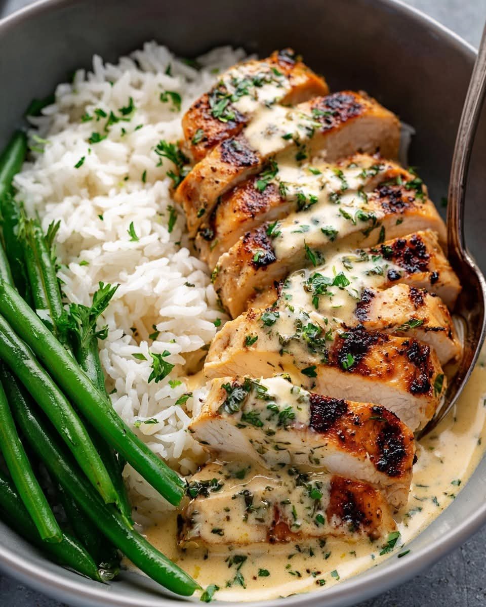 A comforting and flavorful dinner plate featuring tender chicken breasts simmered in a rich herb cream sauce, served with fluffy rice and lightly sautéed green beans. This meal balances creamy, savory flavors with fresh vegetables, making it perfect for a satisfying lunch or dinner. The herbs add fragrance while the cream sauce keeps the chicken juicy and delicious.