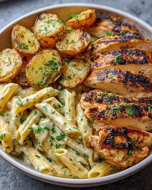 Herb Grilled Chicken with Creamy Penne & Garlic Roasted Baby Potatoes