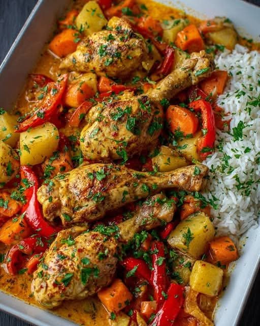 This dish is a wholesome, comforting, and vibrant one-pan meal. Juicy chicken drumsticks are marinated with aromatic herbs and roasted to golden perfection alongside colorful vegetables like bell peppers, carrots, and zucchini. Served over fluffy steamed rice, this meal is hearty yet light, perfect for a weeknight dinner or a cozy family gathering.