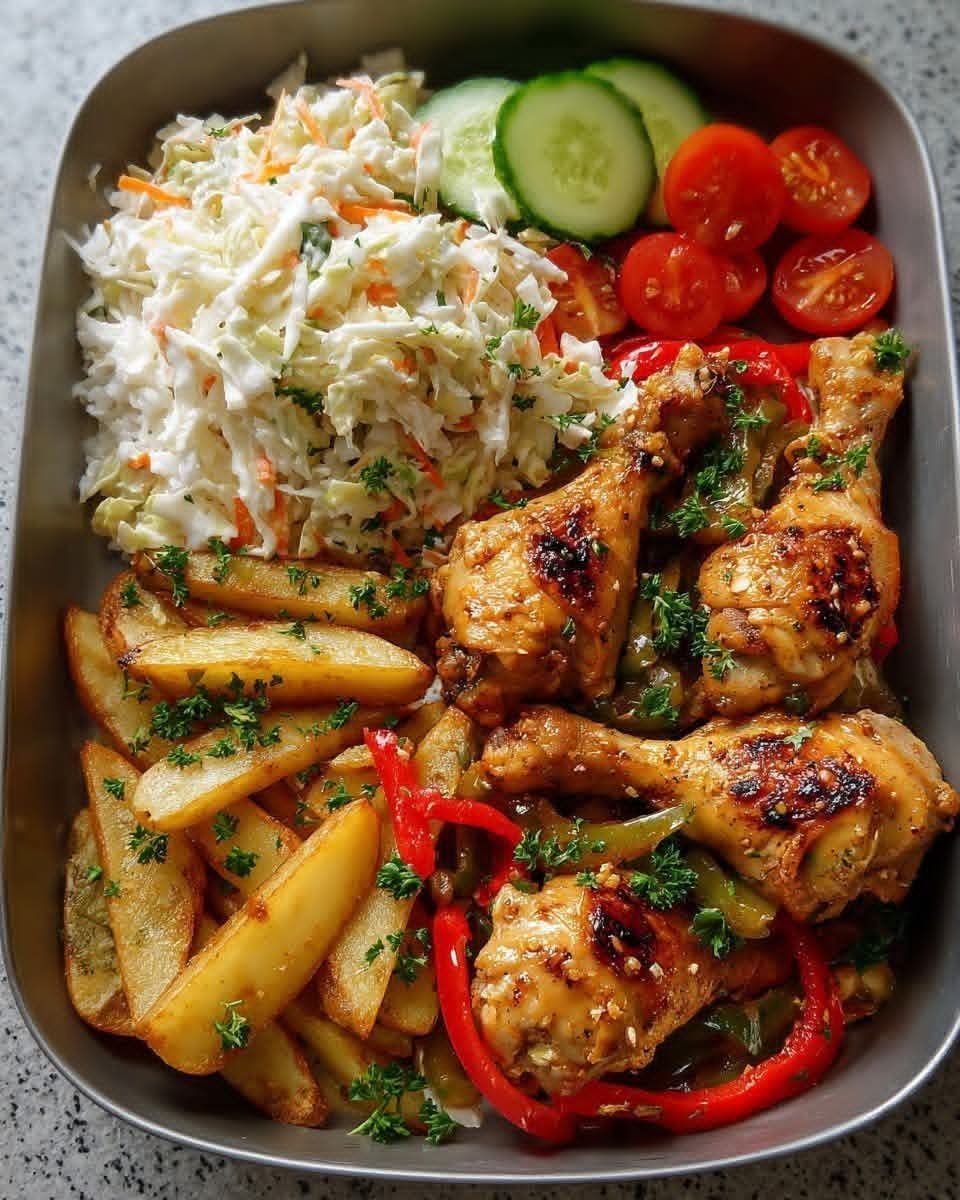Assemble the plate: Arrange crispy potato wedges, roasted drumsticks with peppers, coleslaw, and fresh veggies on a plate. Garnish with chopped parsley.