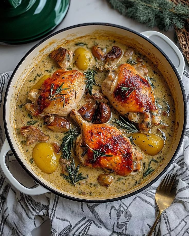 Tender, juicy chicken roasted with aromatic herbs and served with a silky, creamy white sauce. Baby potatoes roast alongside, absorbing all the flavors, while green and black olives add a savory, slightly tangy finish. This dish is elegant, hearty, and healthy enough to feel wholesome while tasting rich.