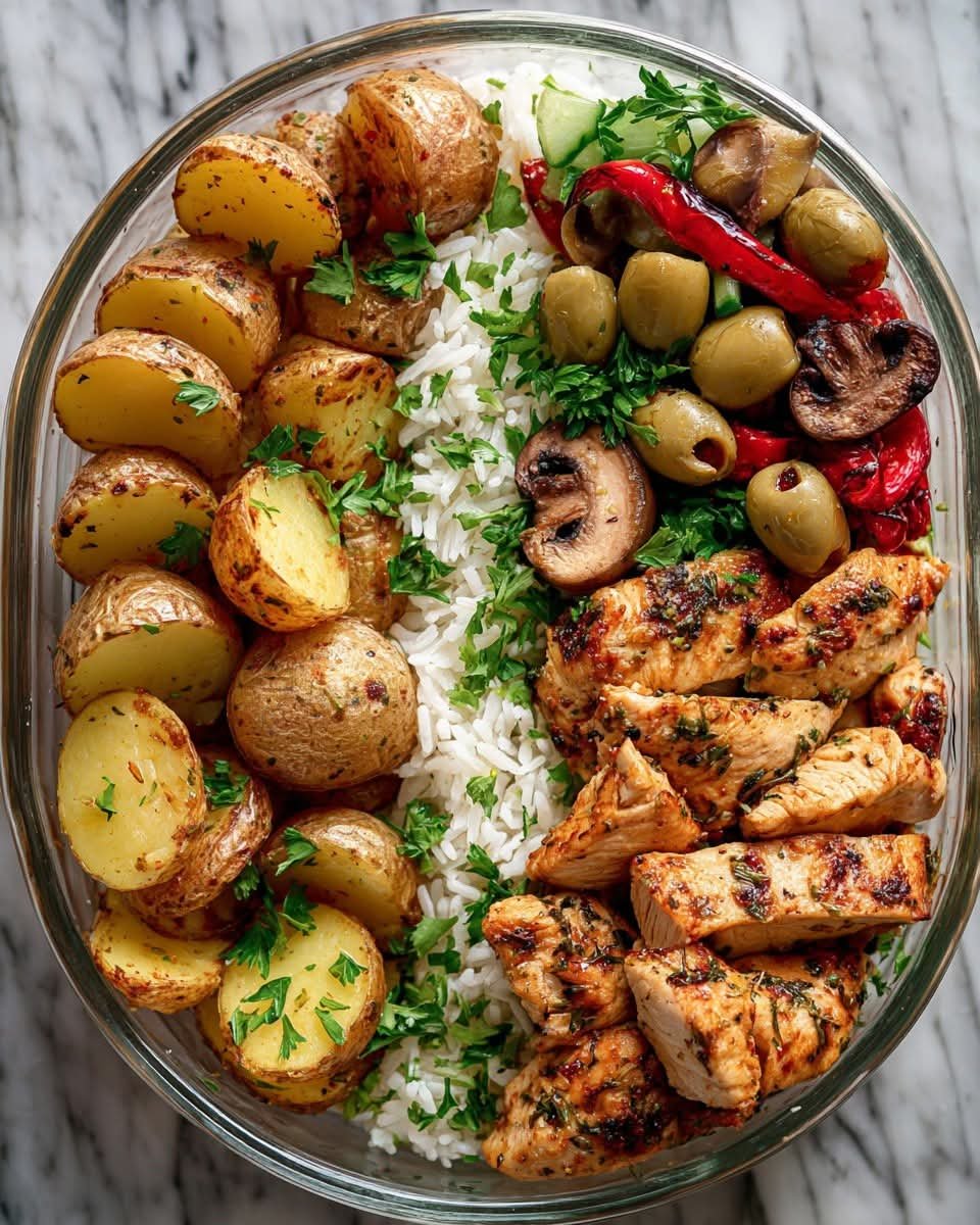 This Mediterranean-inspired bowl features juicy herbed grilled chicken, crispy roasted potatoes, fluffy rice, and colorful veggies — all tied together with cool, creamy tzatziki sauce. It’s bright, balanced, and deeply satisfying — perfect for meal prep or a fresh weeknight dinner.