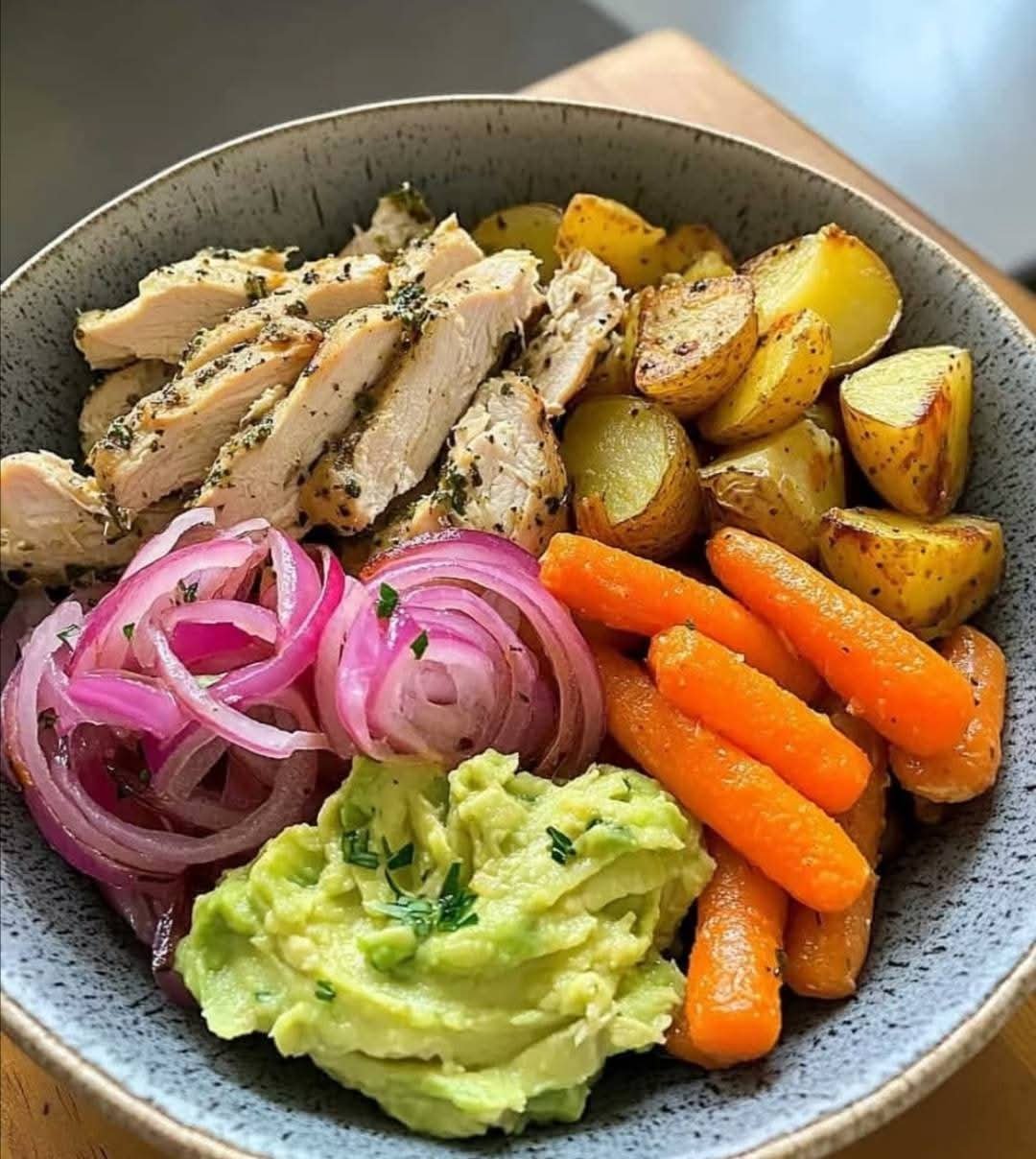 This vibrant, nutrient-packed bowl features tender, herb-marinated chicken paired with colorful roasted vegetables. The combination of garlic, fresh herbs, and olive oil brings a fragrant, savory flavor to the chicken, while the veggies roast to caramelized perfection. Served over your choice of grains or greens, this bowl is perfect for meal prep, lunch, or a wholesome dinner.