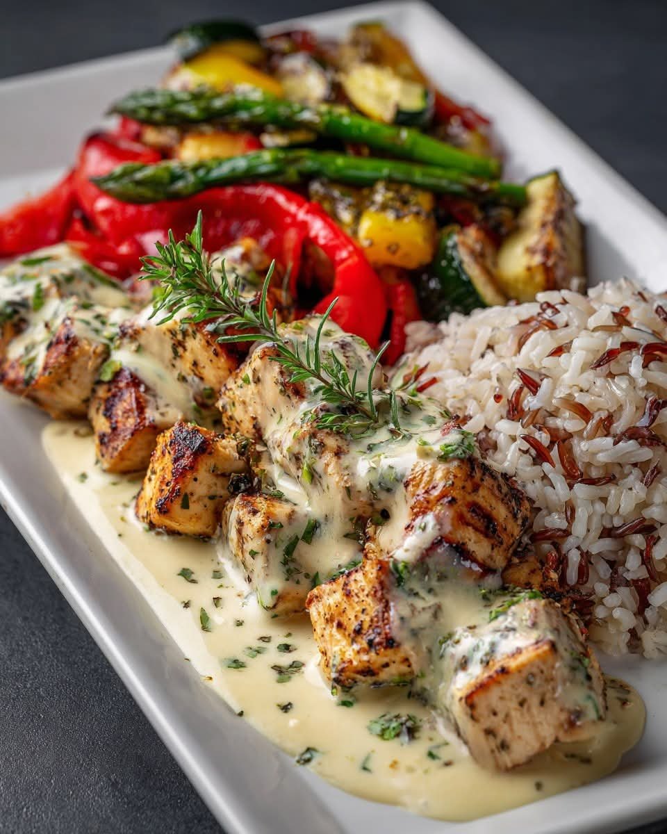 Juicy herb-marinated chicken bites grilled to perfection, topped with a creamy garlic-herb sauce and served with nutty wild rice and vibrant sautéed vegetables. A nourishing, high-protein Mediterranean-inspired dinner that feels indulgent yet light.