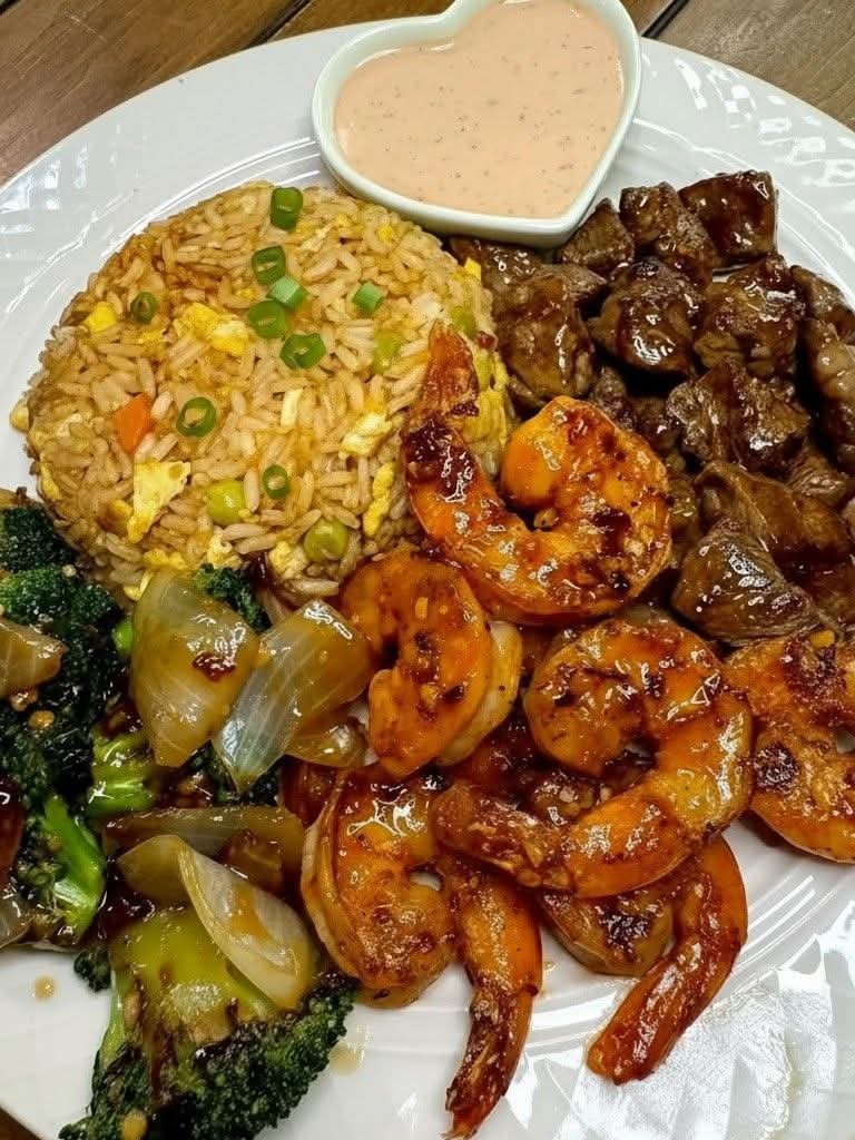 This dish combines tender steak and succulent shrimp cooked quickly at high heat with garlic, and soy sauce. It’s typically served with fried rice, vegetables, and yum yum sauce. The high heat gives the meat a flavorful sear while keeping it juicy.