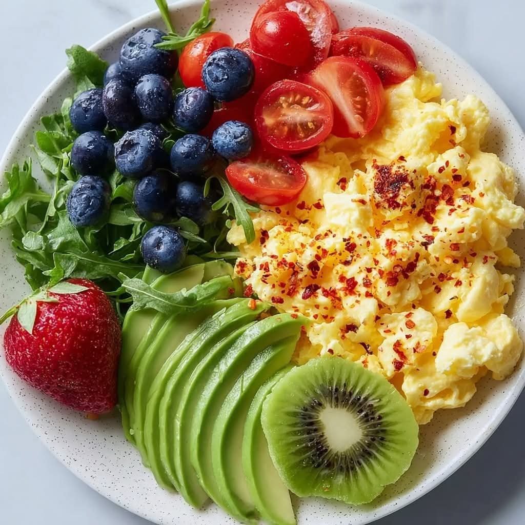 This breakfast plate is designed to give you 30–40g of high-quality protein, steady energy, and balanced nutrition. It includes scrambled eggs, grilled chicken sausage, Greek yogurt with berries, and avocado toast.