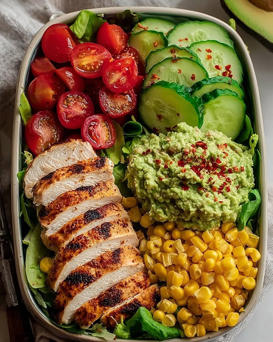 This wholesome power bowl combines grilled or pan-seared chicken breast, creamy homemade guacamole, fiber-rich grains or greens, and crisp vegetables. It’s high in protein, loaded with healthy fats from avocado, and packed with vitamins and minerals.