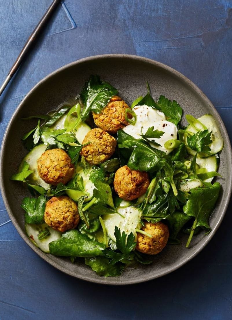 Homemade falafel in half an hour? And without the hassle of deep-frying?? You heard that right! Skip the pita, too, and serve these golden, crisp falafel balls over a refreshing cucumber-herb salad.