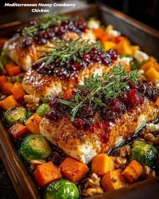 This Honey Cranberry Chicken Bake is the kind of dish that feels festive yet totally doable on a weeknight. Juicy chicken is roasted alongside caramelized Brussels sprouts, sweet potato, and butternut squash, all coated in a glossy cranberry-honey glaze that balances sweet, tart, and savory beautifully. On the side, a fresh carrot, feta, and walnut salad adds crunch, creaminess, and brightness—making this meal comforting, colorful, and deeply satisfying.