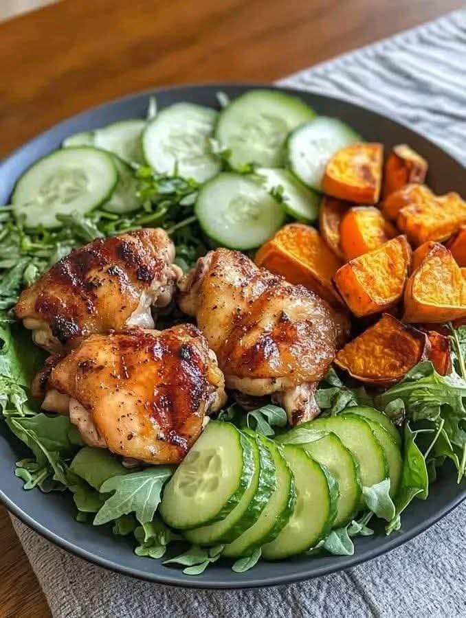 This dish combines the rich, savory-sweet flavors of honey garlic chicken with the earthy sweetness of roasted sweet potatoes and a crisp side of fresh greens. It’s a perfect balance of hearty and healthy, ideal for a satisfying lunch or dinner. The honey garlic glaze coats juicy chicken thighs or breasts, while the roasted sweet potatoes offer a caramelized, slightly smoky flavor. The fresh greens bring a refreshing crunch, tying everything together for a wholesome meal.