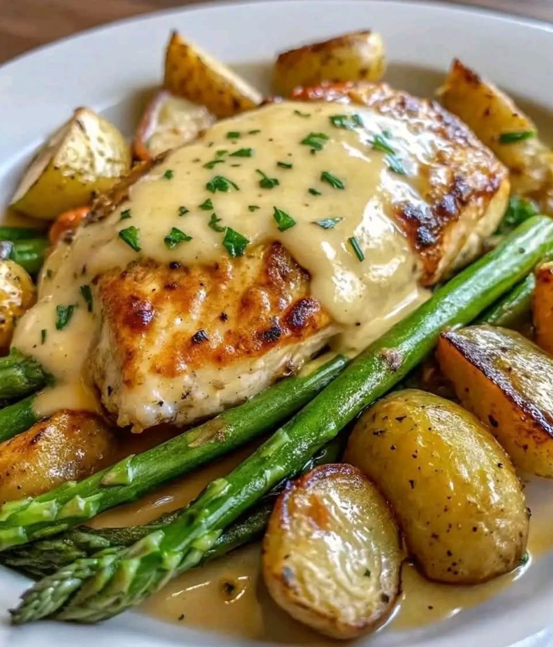 This dish is a perfect balance of savory, sweet, and creamy. Tender chicken breasts are coated in a tangy honey mustard glaze and baked to juicy perfection, paired with roasted asparagus tossed in olive oil and topped with melted cheese. It’s a simple yet gourmet-quality meal that’s family-friendly, low-carb, and packed with protein and flavor.