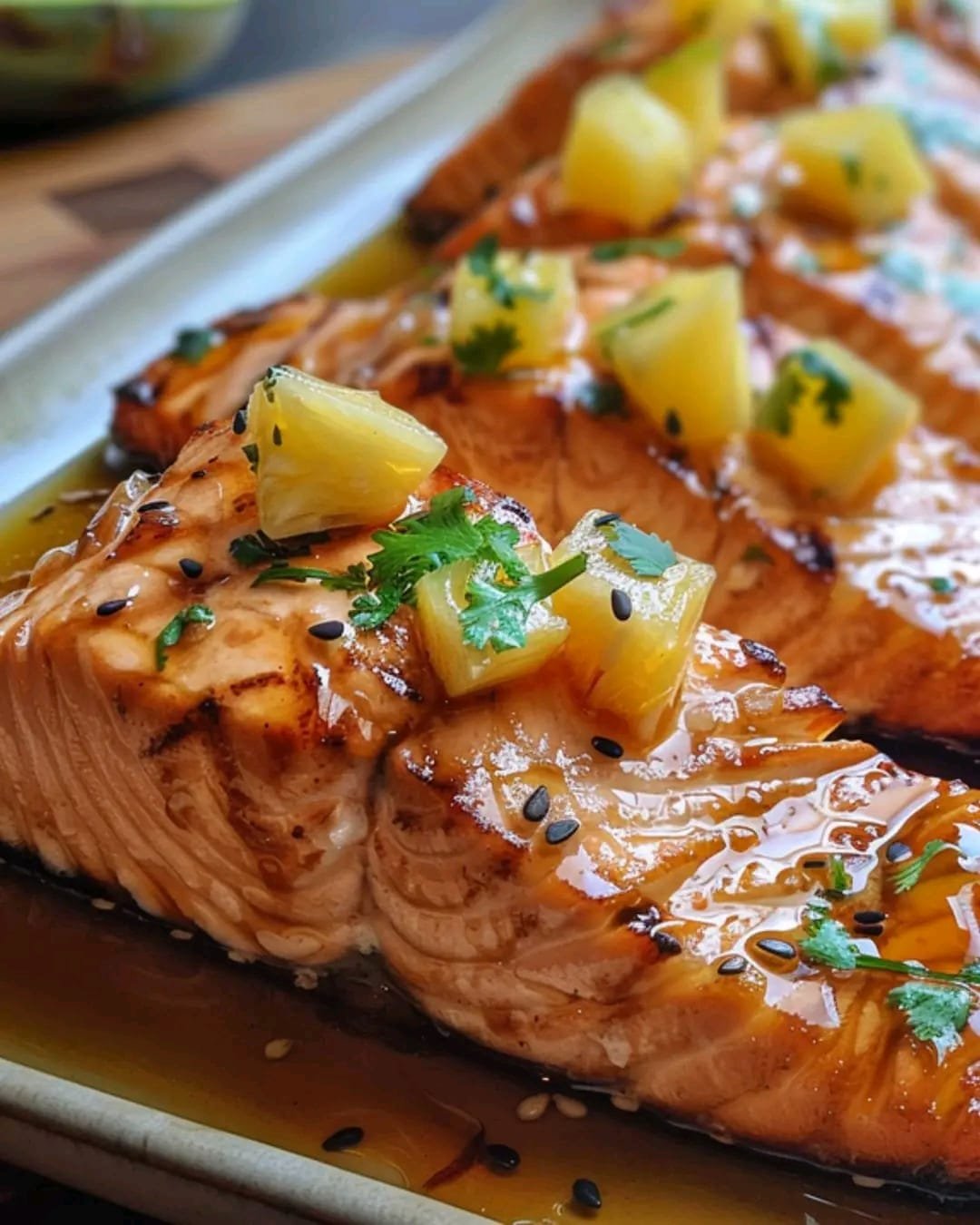 6️⃣ Once cooked, remove the salmon from the oven and garnish with sliced pineapple and chopped fresh cilantro if desired.