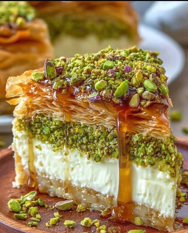 Honeyed Pistachio Baklava Cheesecake is a luxurious fusion dessert featuring a crisp, buttery phyllo base layered with pistachios and honey, topped with a smooth, creamy cheesecake filling, and finished with a golden honey syrup glaze. It combines Middle Eastern flavors with classic Western cheesecake—perfect for special occasions or impressing guests.