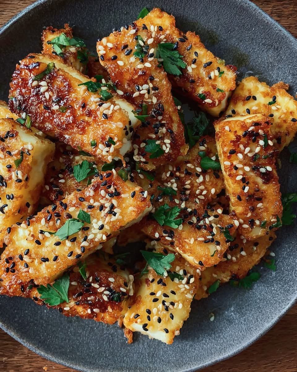 A crispy, golden crusted halloumi cheese coated in sesame seeds, served warm and drizzled with sticky-spicy hot honey. A satisfying appetizer or salad topping with bold sweet-heat flavor.
