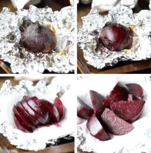 - No need to peel the beets before roasting – when they’re done cooking, their skins basically just rub off with little effort using gloves or a paper towel.