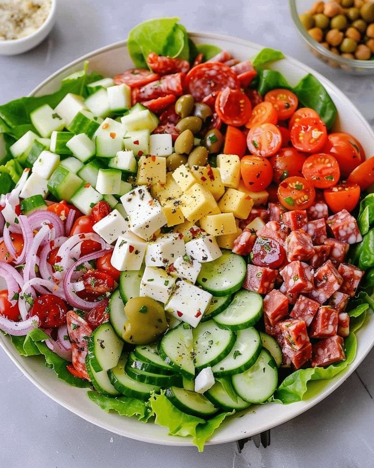 This Italian chopped salad is a hearty, satisfying mix of crisp romaine, juicy tomatoes, cucumbers, chickpeas, and tangy cheese tossed in a bold herbed vinaigrette. It’s the perfect side for pasta, pizza, or grilled chicken — or a complete light lunch on its own!