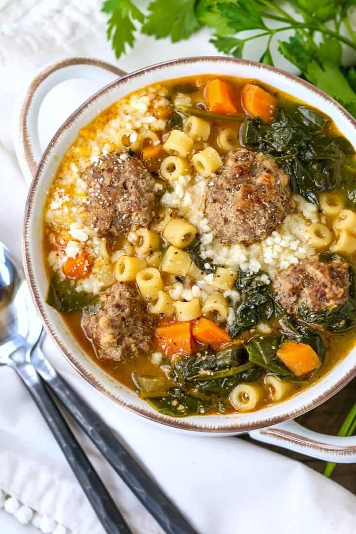 This hearty soup dish includes everything you need in one bowl: meatballs, pasta, and veggies in a rich broth finished with grated parmesan cheese!Every taste of Italian Wedding Soup is full of meatballs, noodles, and veggies! A delicious, healthful soup recipe that will please everyone!