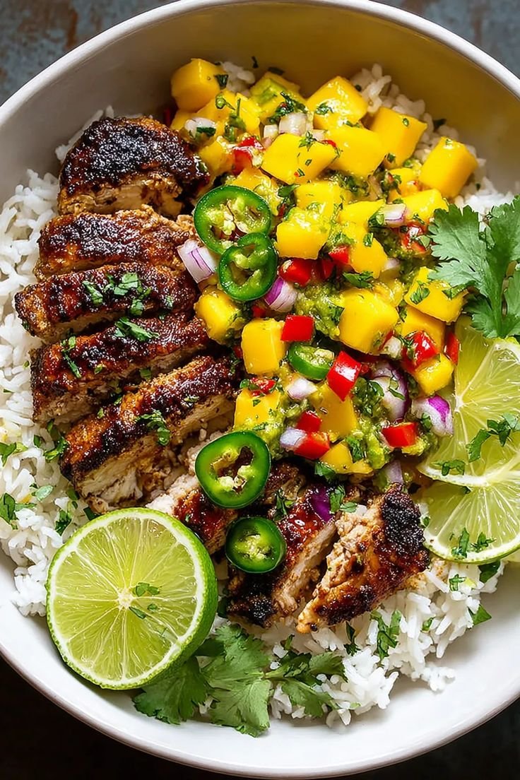 Jerk Chicken Bowls with Mango Salsa & Coconut Rice