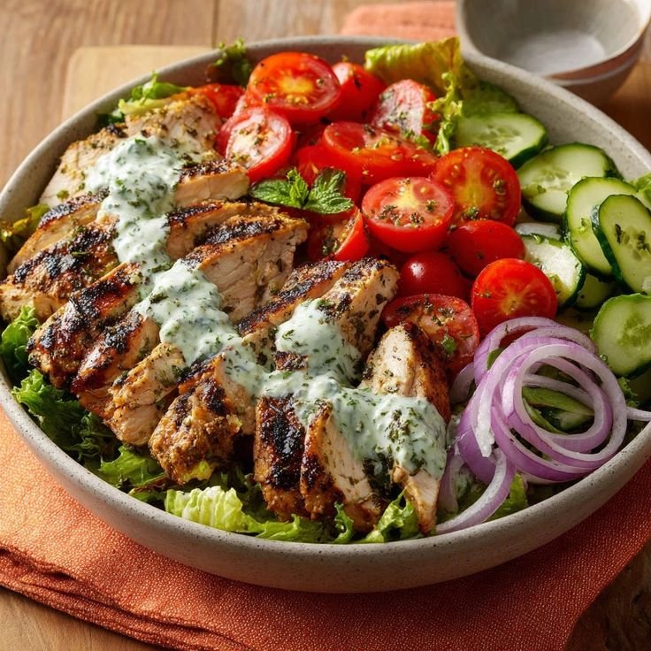 Tender, juicy grilled chicken served over crisp greens, cucumbers, tomatoes, avocado, and a bright lemon-herb dressing. Light, refreshing, and high-protein.