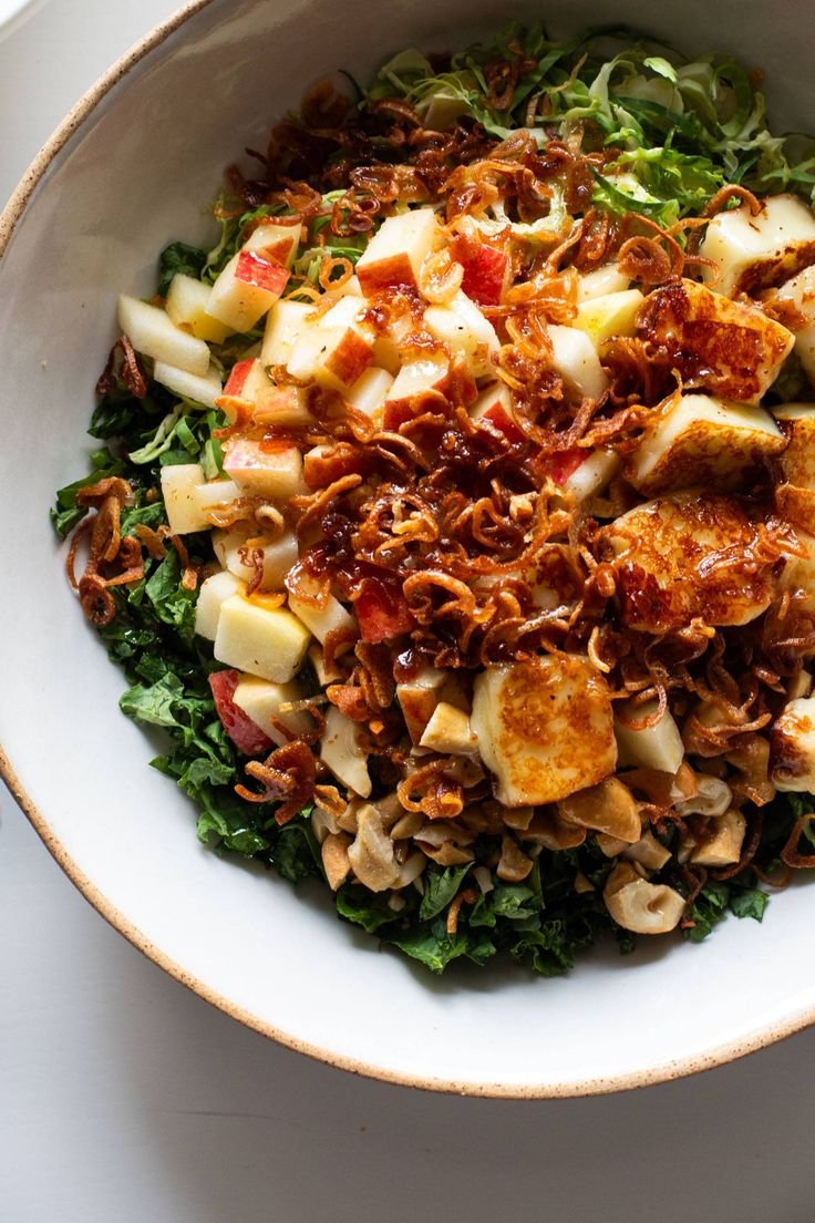 This vibrant salad features finely shredded kale, crisp apples, toasted nuts, tangy feta, and golden crispy shallots tossed in a light lemon-honey vinaigrette. It’s a perfect mix of sweet, savory, and crunchy — ideal for a healthy lunch, side dish, or a festive gathering.