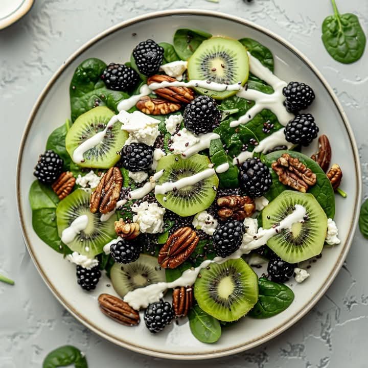 This refreshing Kiwi Salad with Blackberries and Pecans is a delightful mix of sweet, tart, and nutty flavors. It’s packed with vitamins, fiber, and antioxidants, making it a perfect light lunch or side dish. The combination of juicy kiwi, plump blackberries, crunchy pecans, and a light honey-lime dressing creates a balanced and delicious dish.