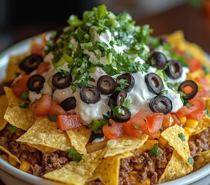 The robust basis of refried beans and ground beef, complemented by the zesty, spicy zing of sour cream, the strong, flavorful splash of salsa, the creamy richness of melted cheese, the crisp, refreshing crunch of fresh lettuce, the juicy sweetness of tomatoes, the salty, oniony depth of black olives and green onions, and the gratifying crunch of tortilla chips. This filling, adaptable treat is ideal for get-togethers, events, or casual dinners!