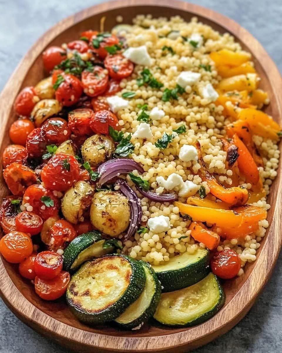 This Lemon and Feta Roasted Vegetable Couscous Platter features fluffy couscous topped with colorful, caramelized roasted vegetables, tangy lemon dressing, and creamy crumbles of feta. It’s a light yet satisfying dish that brings out the best of Mediterranean flavors, ideal for picnics, potlucks, or weeknight dinners.