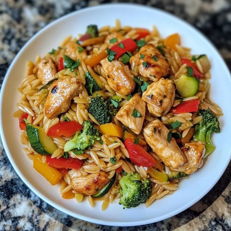 A light yet satisfying stir fry where tender chunks of lemony chicken are sauteed with garlic and vegetables, then tossed with orzo pasta and a bright lemon-olive oil dressing. Perfect for a weeknight dinner that feels a little fancy, yet is easy and fast to make.