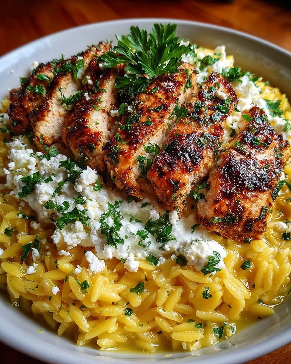 A bright, creamy Mediterranean-style dish with juicy lemon garlic chicken, tender orzo, and fluffy whipped feta infused with roasted garlic. Fresh, comforting, and packed with bold flavor.