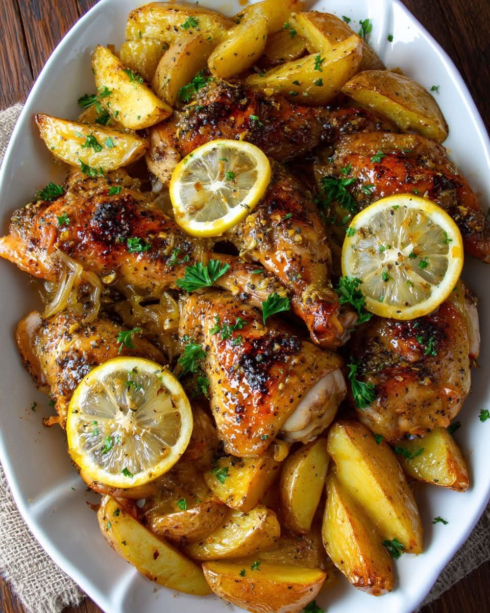 Lemon Garlic Roasted Chicken & Potatoes is a comforting one-pan meal featuring juicy, tender chicken roasted with crispy golden potatoes in a bright lemon-garlic herb marinade. The lemon adds freshness, garlic gives bold flavor, and roasting brings everything together with a rich, savory taste. It’s simple, family-friendly, and perfect for weeknight dinners or special meals.