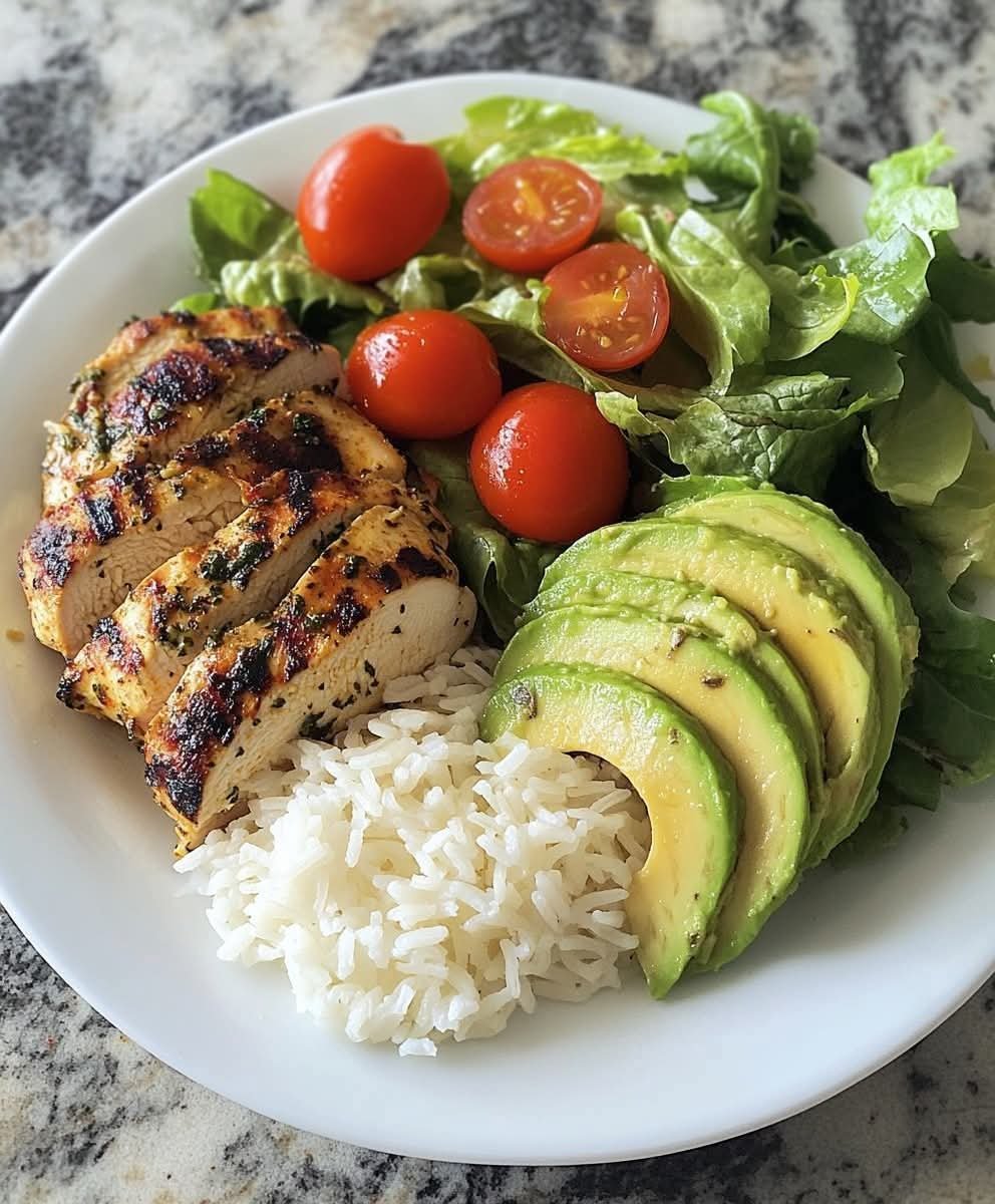 A clean, wholesome meal featuring juicy lemon-herb grilled chicken, a creamy ripe avocado, fluffy rice, and a crisp lettuce-tomato salad. Light, refreshing, and perfect for a weekday lunch!