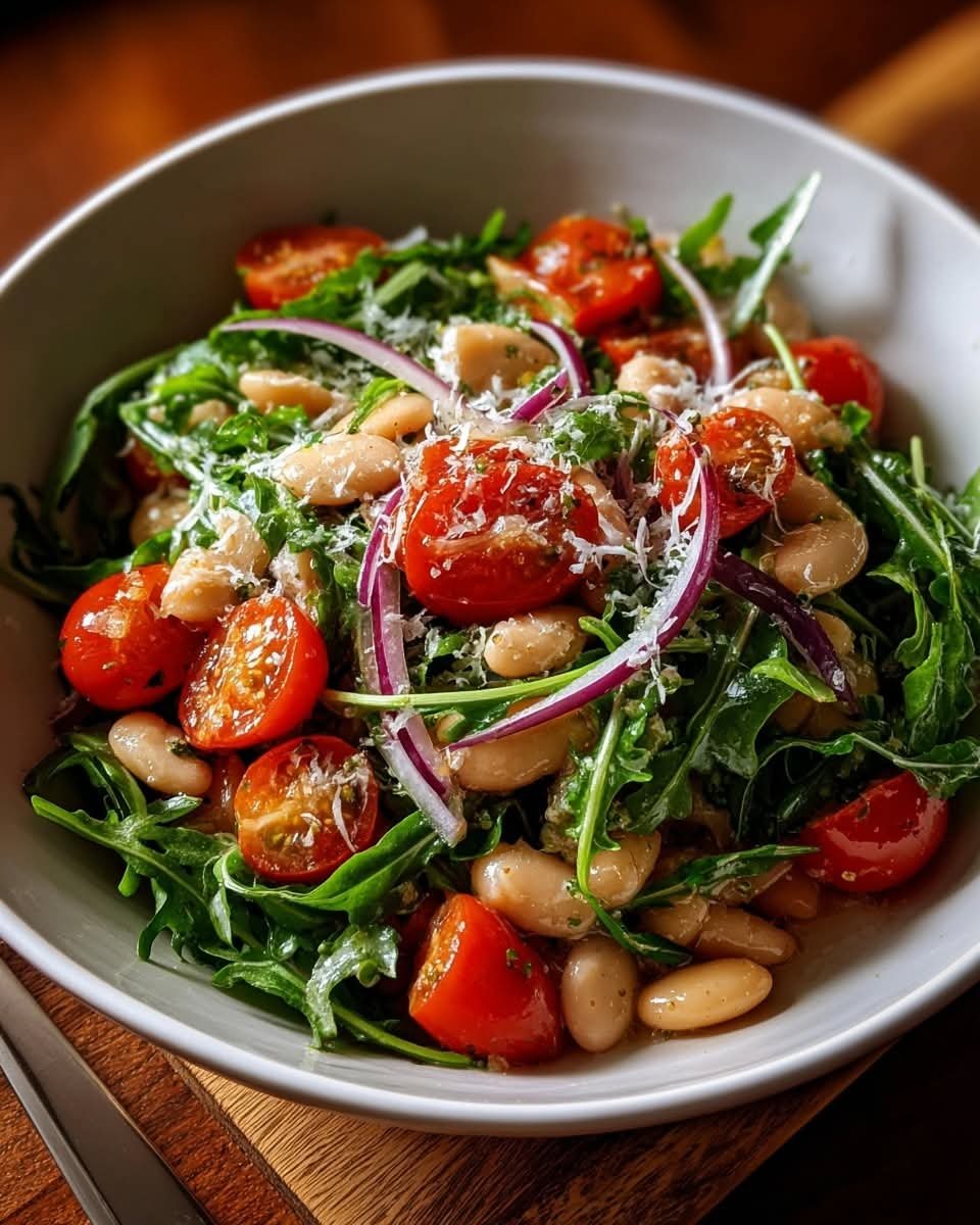 In a large bowl, combine white beans, arugula, red onion, and cherry tomatoes.