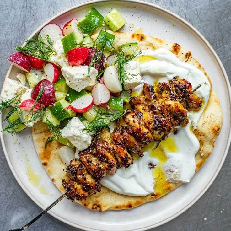 This dish features juicy chicken marinated in lemon, garlic, and oregano, grilled to perfection on skewers. Served with a crisp Mediterranean-style mixed salad, it’s zesty, herbaceous, and perfect for summer grilling or a healthy weeknight dinner.