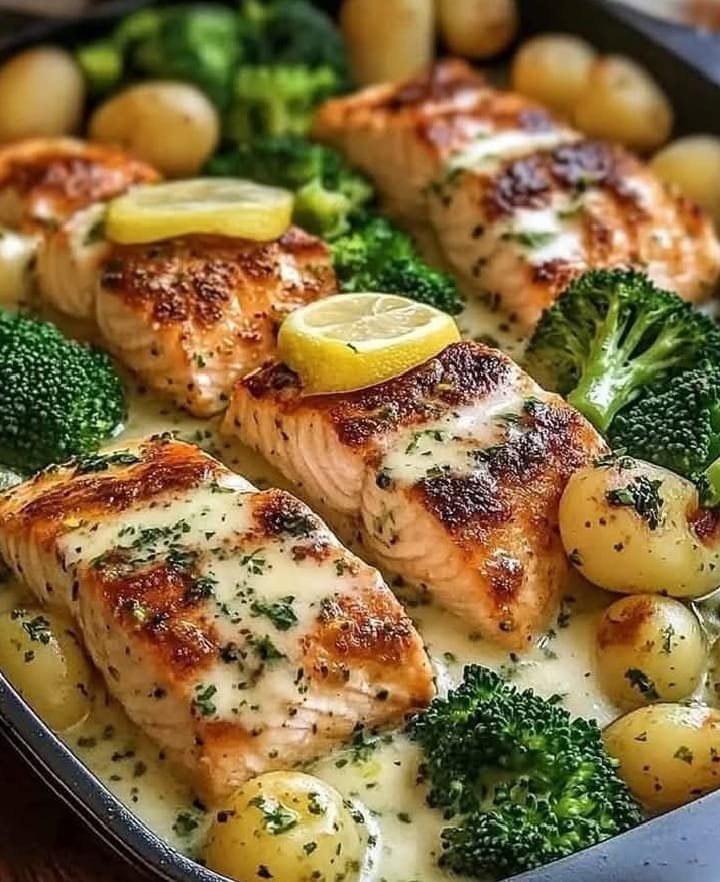 A simple yet flavorful dish combining tender, flaky salmon with crispy potatoes and perfectly roasted broccoli, all brought together with a zesty lemon finish.