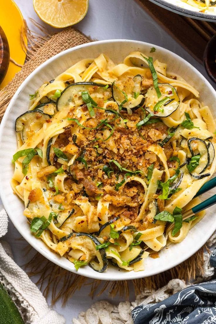 A fresh, vibrant pasta tossed with sautéed zucchini, lemon, parmesan, and topped with a crunchy garlic–chili breadcrumb. Light, creamy (without cream!), and perfect for a quick meal.