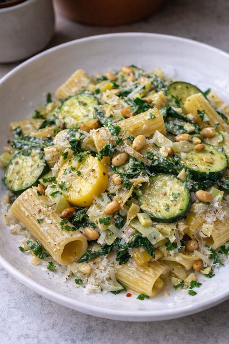 This Mediterranean-inspired pasta dish is bright, creamy, and light. Tender rigatoni is tossed with sauteed zucchini, garlic, fresh lemon juice, and olive oil, then finished with grated Parmesan for savory richness. Quick, healthy, and perfect for lunch or dinner.