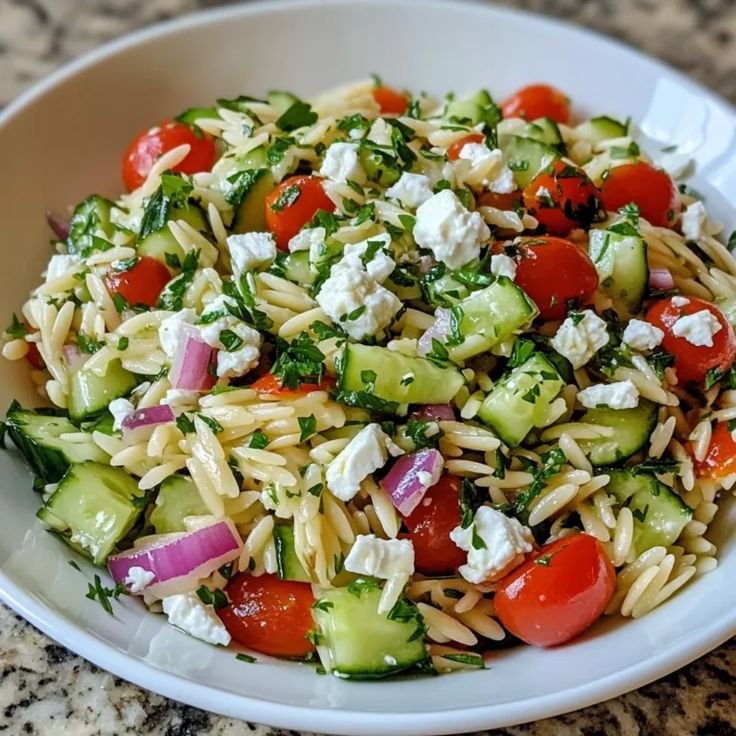 This salad features tender orzo, crisp cucumber, tangy feta, and a vibrant lemon dressing. It’s a Mediterranean-inspired dish that’s perfect as a side, light lunch, or meal prep option.