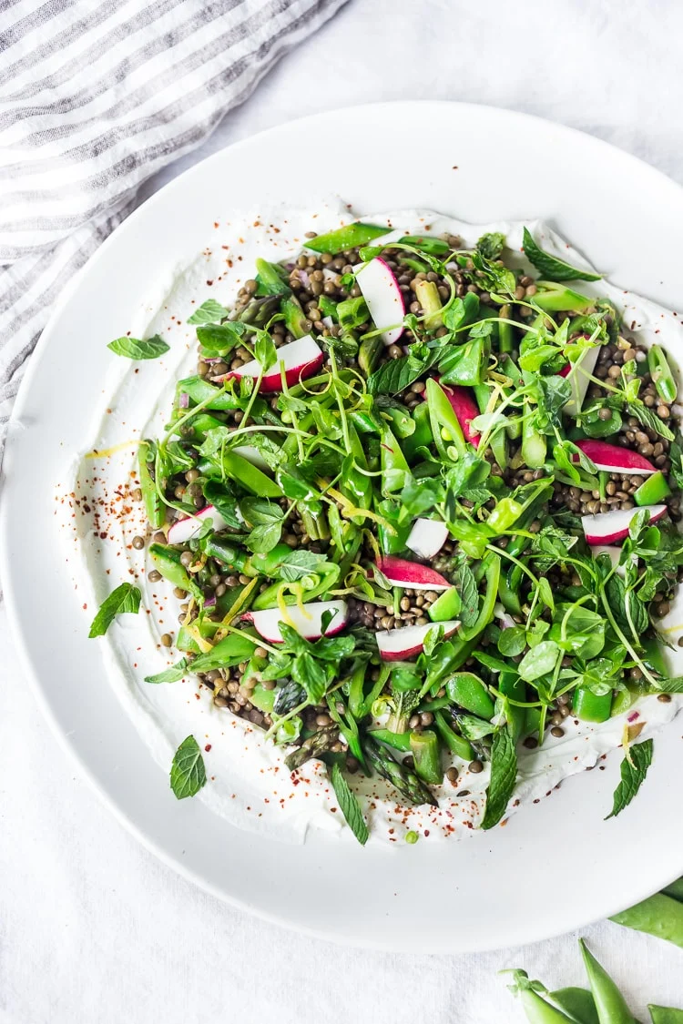 A delicious, healthy, Greek inspired lentil salad recipe with spring veggies, lemon and mint served over optional yogurt sauce. Vegan adaptable and Gluten-Free
