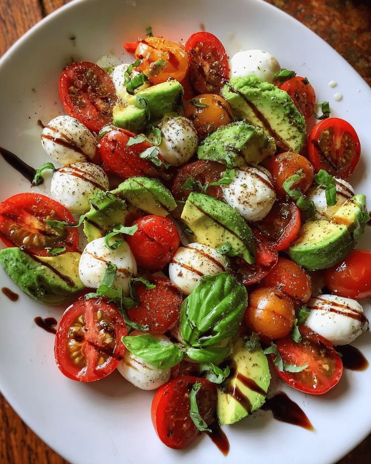 A refreshing Mediterranean-style twist on the classic Caprese. Creamy avocado meets juicy tomatoes, soft mozzarella, and fragrant basil — all drizzled with a bright lemon-olive oil dressing. It’s light, clean, naturally gluten-free, and takes only 10 minutes to make.