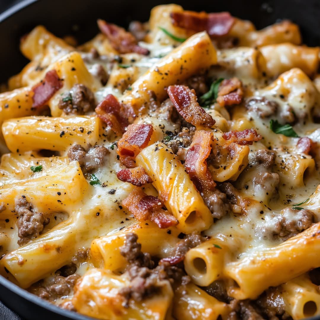 Loaded Bacon Cheeseburger Pasta is the ultimate comfort food mashup — all the flavors of a juicy bacon cheeseburger in a creamy, cheesy pasta dish. Ground beef, smoky bacon, melty cheese, and tender pasta are brought together in a rich, savory sauce that tastes like your favorite diner classic — but in one skillet!