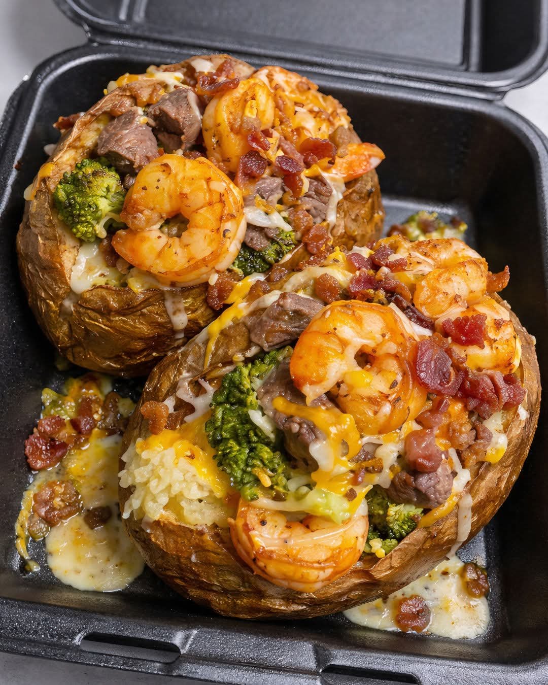 Loaded Baked Potatoes with Shrimp, Steak, and Cheese