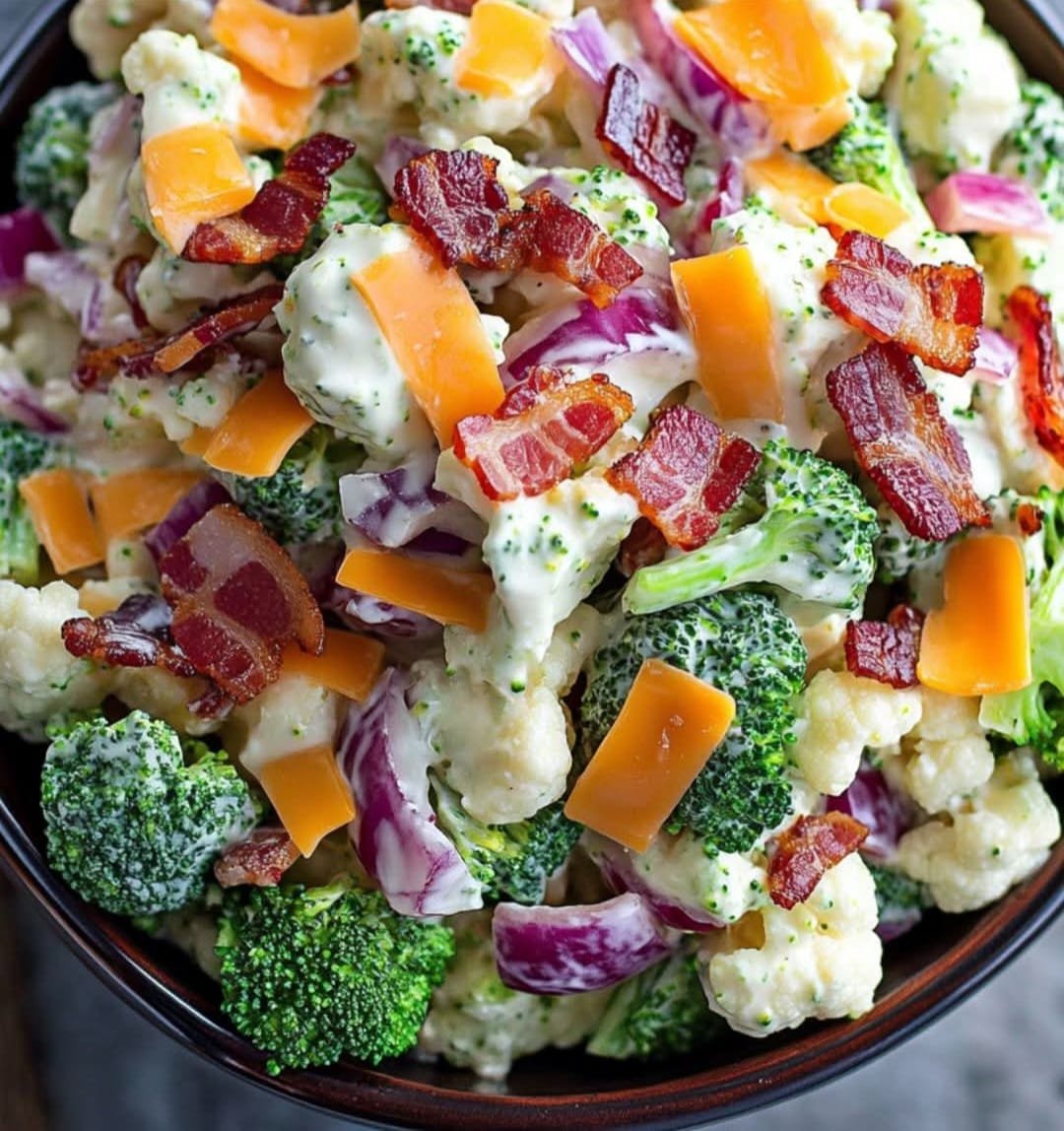 This vibrant and nutrient-packed salad is perfect for low-carb lifestyles. It features fresh, crisp broccoli florets tossed with a creamy, tangy dressing. The salad is “loaded” with savory ingredients like crispy bacon, shredded cheddar cheese, and crunchy sunflower seeds for texture and flavor. Red onions add a zesty kick, while optional add-ins like diced boiled eggs or avocado make it even more satisfying.