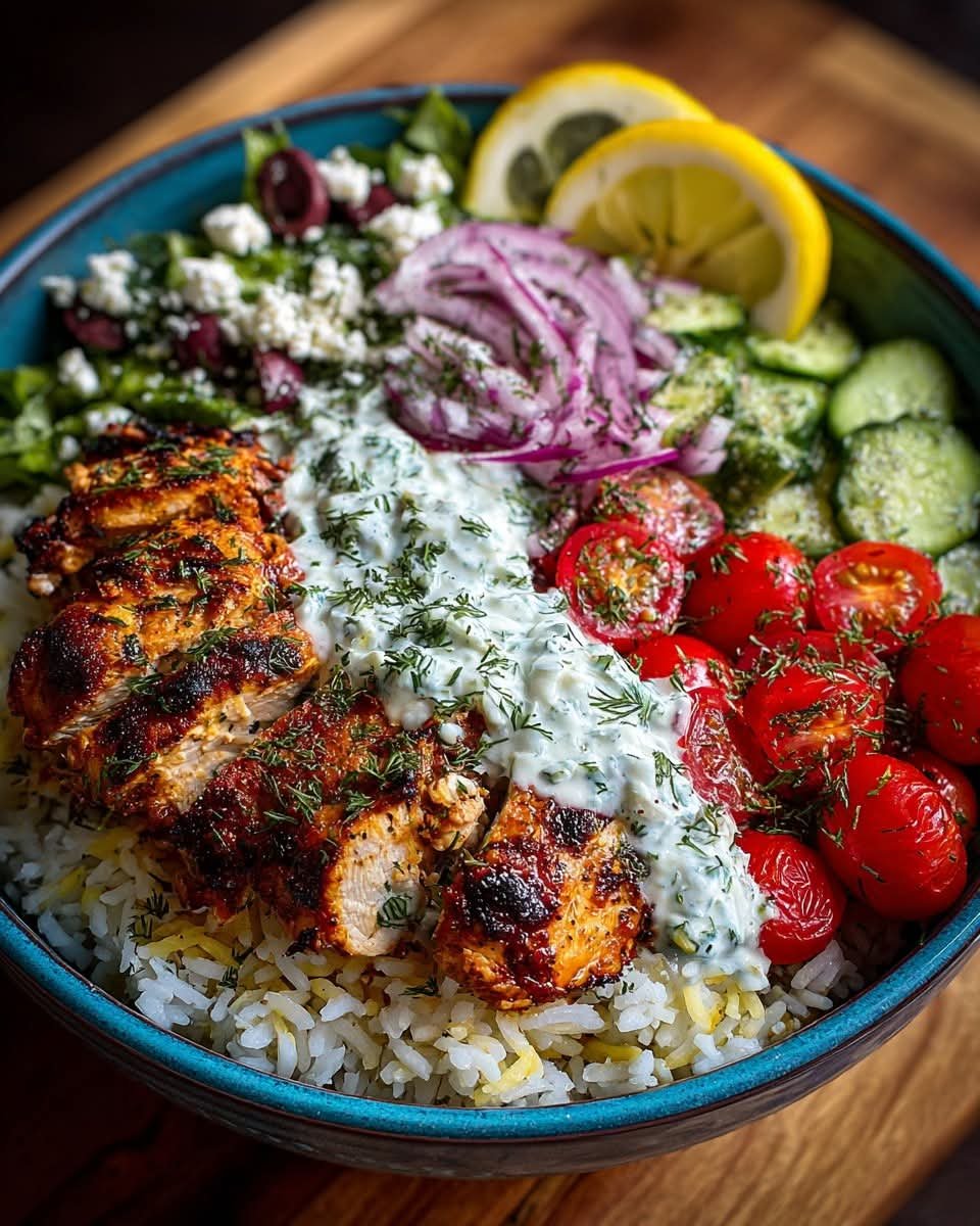 This vibrant Mediterranean power bowl combines juicy, herb-marinated chicken with fluffy grains, crisp vegetables, creamy lemon tzatziki, and tangy feta cheese. It’s balanced, nourishing, and bursting with fresh flavors—perfect for meal prep or a satisfying lunch/dinner.