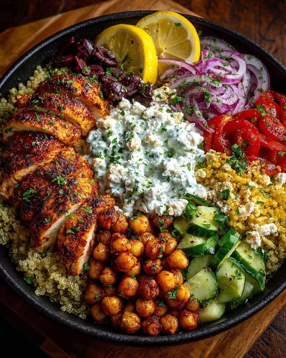 This Loaded Mediterranean Chicken Power Bowl is a vibrant, protein-packed meal inspired by classic Mediterranean flavors. Juicy lemon-herb grilled chicken is layered over fluffy grains and paired with crisp vegetables, creamy homemade tzatziki, and salty feta cheese. It’s refreshing yet filling—perfect for a healthy lunch, post-workout dinner, or meal prep option that never feels boring.
