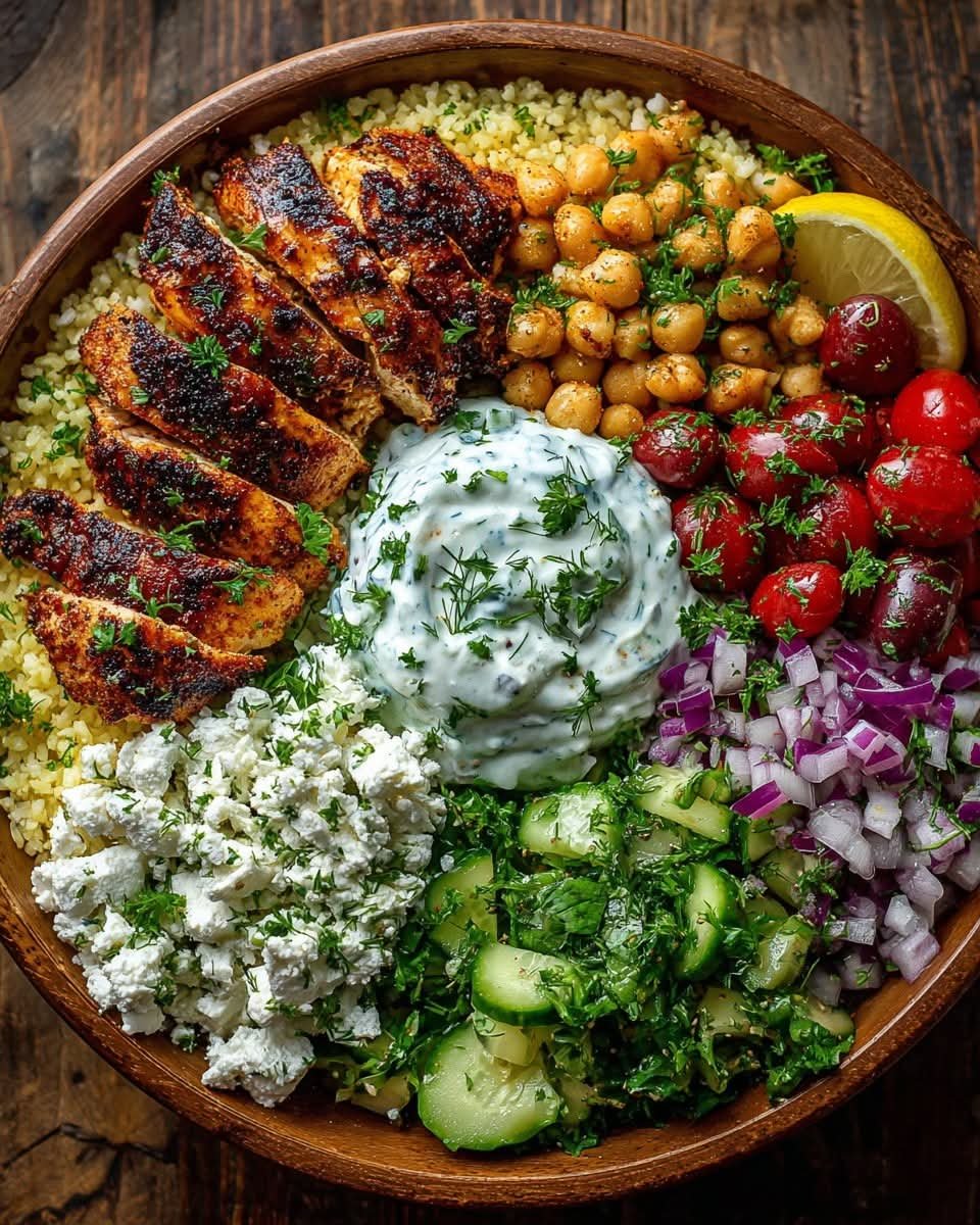 This power bowl brings together juicy herb-marinated chicken, fluffy grains, crisp vegetables, and two creamy, tangy sauces—whipped feta and tzatziki. It’s a balanced, high-protein meal perfect for lunch or dinner, inspired by classic Mediterranean flavors.