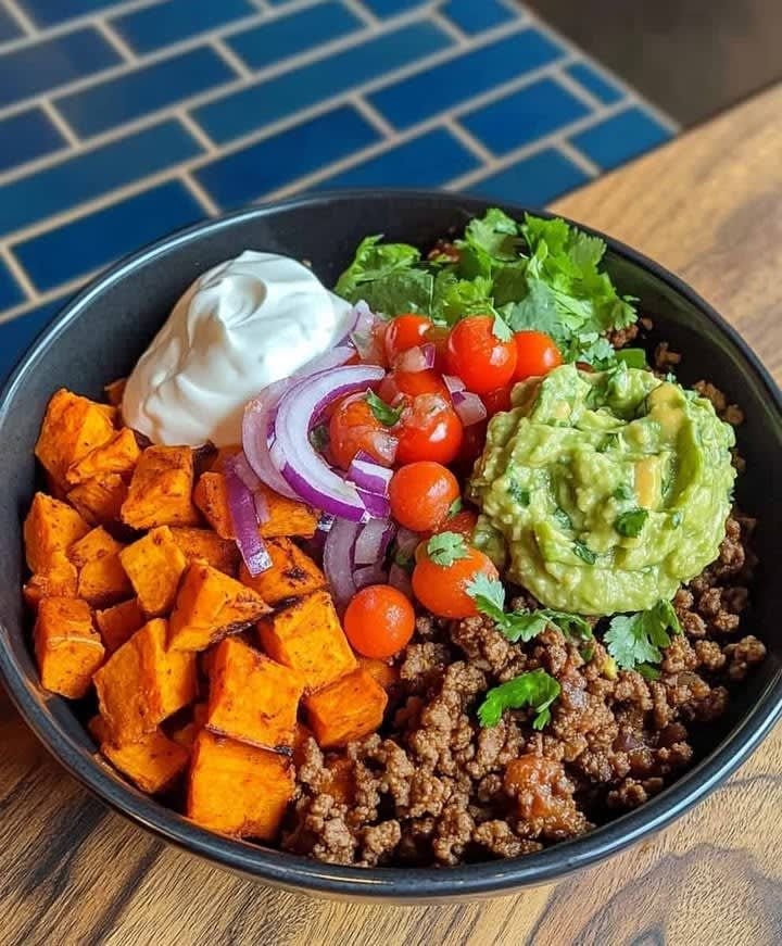 A wholesome bowl featuring roasted sweet potatoes, spiced ground beef, black beans, and creamy guacamole, topped with fresh vegetables. This dish is rich in protein, fiber, vitamins, and healthy fats, making it perfect fo a filling lunch or dinner with a Mediterranean twist.
