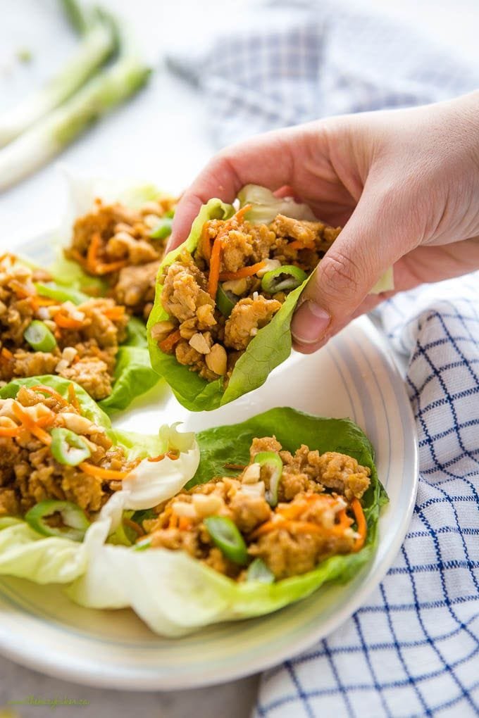 These low-carb Thai lettuce wraps feature ground or shredded chicken sauteed in a savory, slightly sweet, garlicky Thai-style sauce, served in lettuce cups and topped with crunchy veggies, herbs, and peanuts. Fresh, flavorful, and fast!