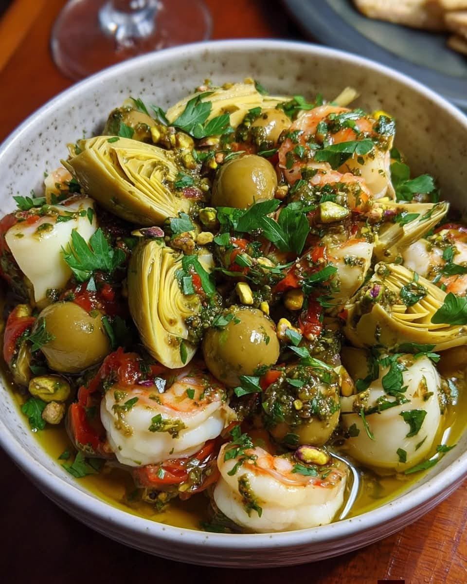 This dish is all about bold Mediterranean flavors with almost no cooking required. Juicy shrimp, tender artichoke hearts, and briny olives soak up a zesty lemon-herb marinade that’s fresh, tangy, and deeply satisfying. It works beautifully as a light main, a make-ahead appetizer, or part of a mezze-style spread.