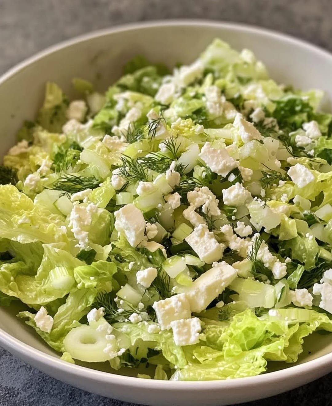 Add the sliced scallions and chopped dill to the bowl with the shredded lettuce.