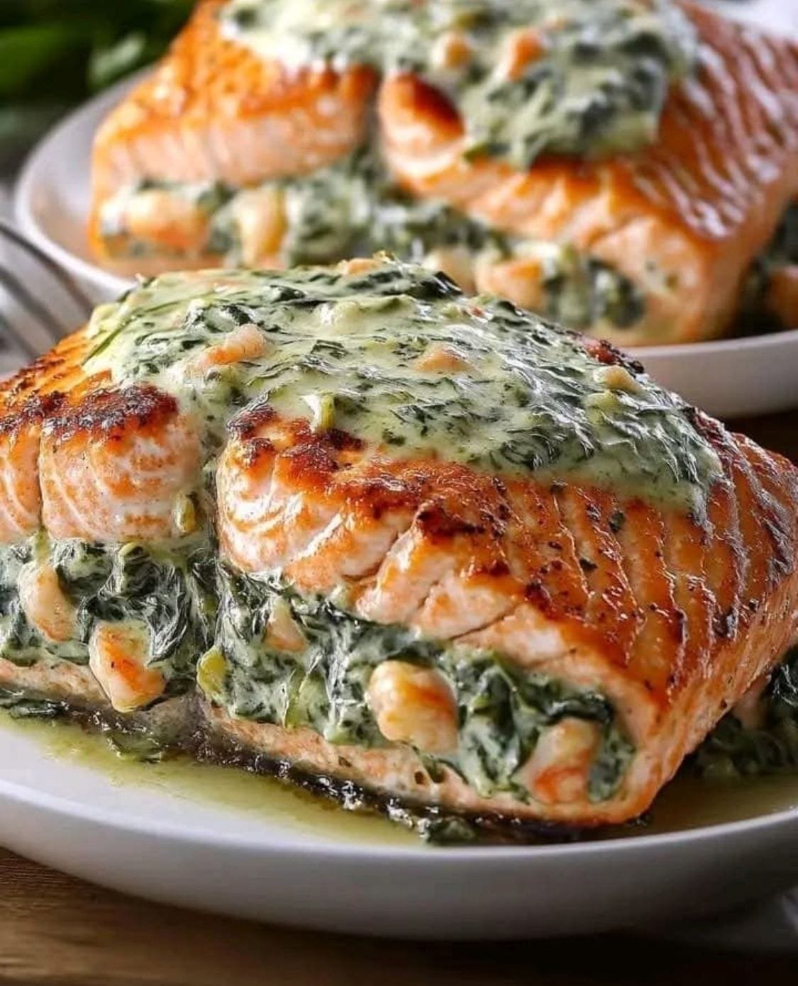The vivid, rich tastes of the Mediterranean with this Salmon Stuffed with Creamy Spinach and Shrimp! This meal has flaky, delicate salmon with a rich filling of sun-dried tomatoes, juicy prawns, and creamy cheese, all flavored with herbs from the Mediterranean. This sophisticated but simple dish may be baked, air-fried, or pan-seared to perfection, making it ideal for a big event or a weekday supper. For a healthy, restaurant-caliber dinner at home, serve it with a light quinoa salad or a side of roasted veggies.